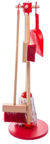 A kisgyerekek élvezhetik a képzeletbeli játékot, miközben segítenek a felnőtteknek a takarításban ezzel a kompakt fa tisztítókészlettel. Tartalmaz egy felmosót, seprűt, lapátot és kefét, mindezek egy fa állványon vannak elhelyezve a könnyű tárolás érdekében. Kiváló minőségű, felelősségteljesen beszerzett anyagokból készült. Megfelel a jelenlegi európai biztonsági előírásoknak. Az 5 részből álló készlet fő jellemzői: 5 részből áll, praktikus állványon tárolható, segíti a mozgáskoordinációt és a valósághű szerepjátékot. Méretek: 10x71x20 cmKor: 3+Anyag: fa, műanyag, egyéb anyag