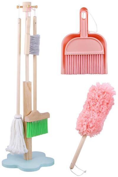 A 6 részes takarító szett minden olyan eszközt tartalmaz, mellyel a gyermekek megtanulhatják a takarítás alapjait, folyamatát. Felmosó, seprű, kislapát seprűvel, portörlő, kefe, és egy tároló fogas található a készletben. A játék anyaga: fa. Méretek:Felmosó: 58 cm. Seprű: 52 cm. Kislapát seprűvel: 21 cm. Portörlő: 34 cm. Kefe: 16 cm. Tároló fogas: 74 cm.